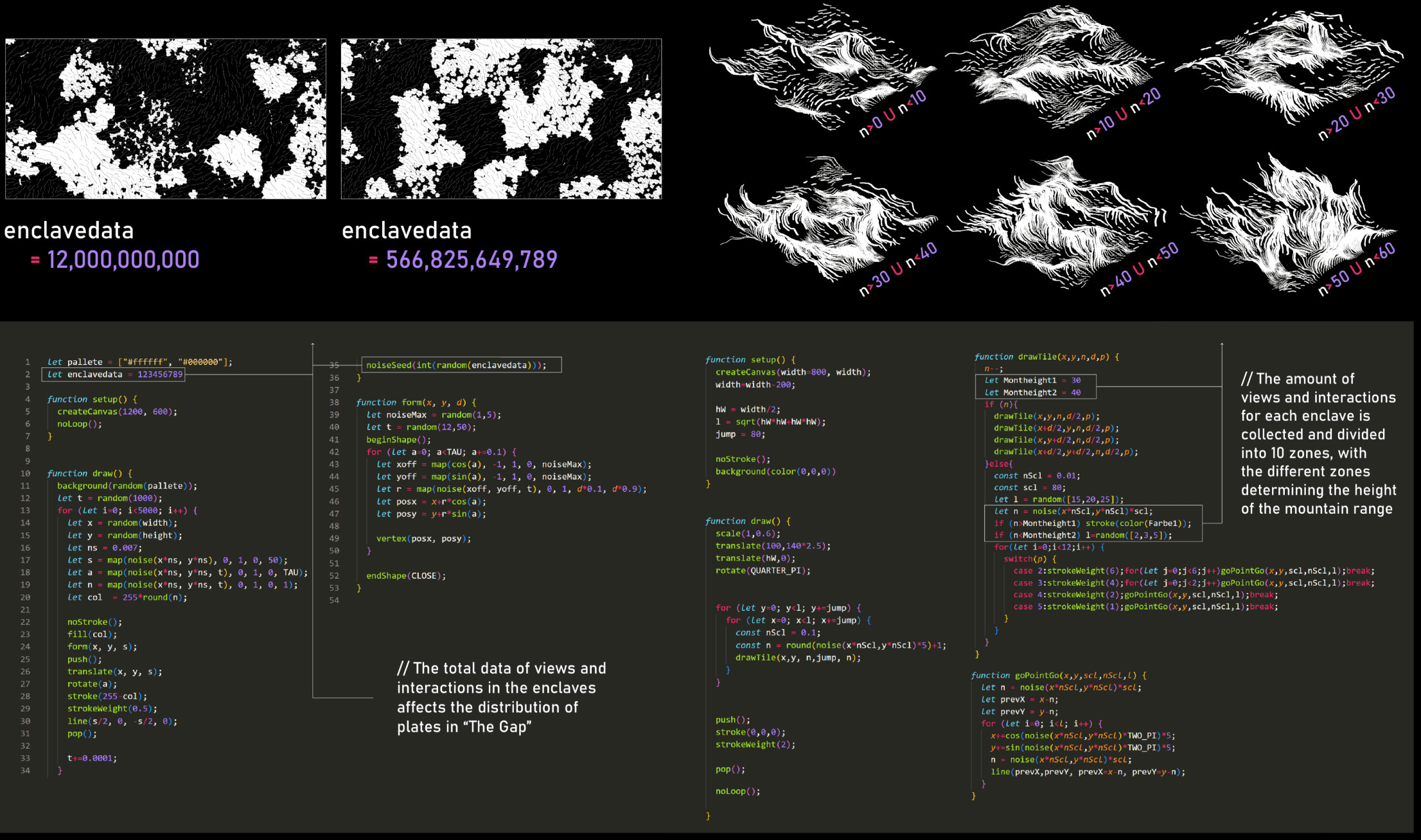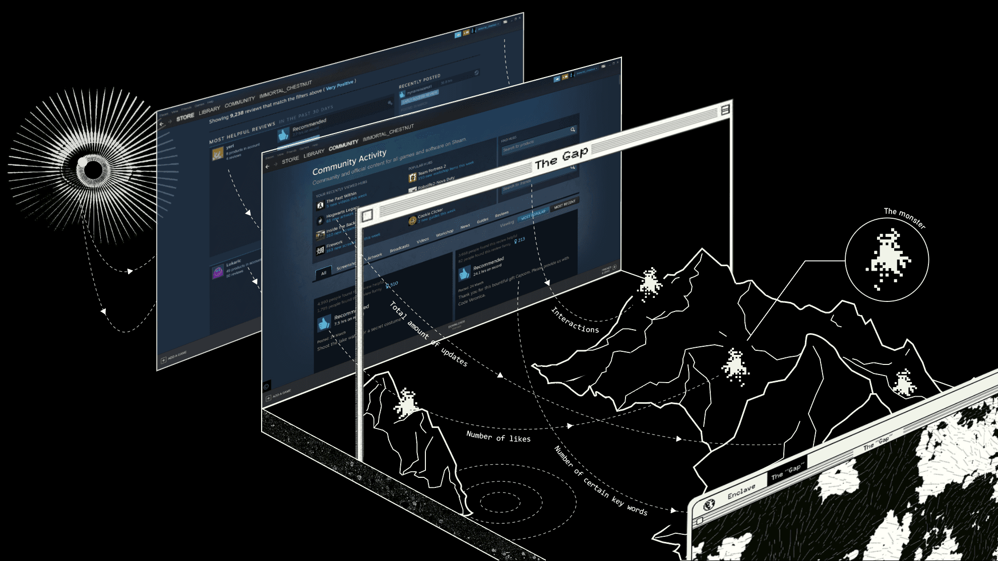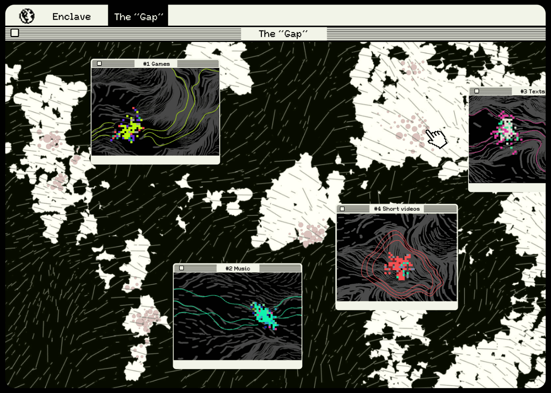 “The Gap” is an interactive web page, also, a gray zone between reality and the Internet enclaves. It is formed by people's fear of reality and protects the existence of enclaves. Here, the data of people's activities in the Internet enclave are translated into the ecosphere of the place, which determines the plates, the terrains and the creatures -- monsters.