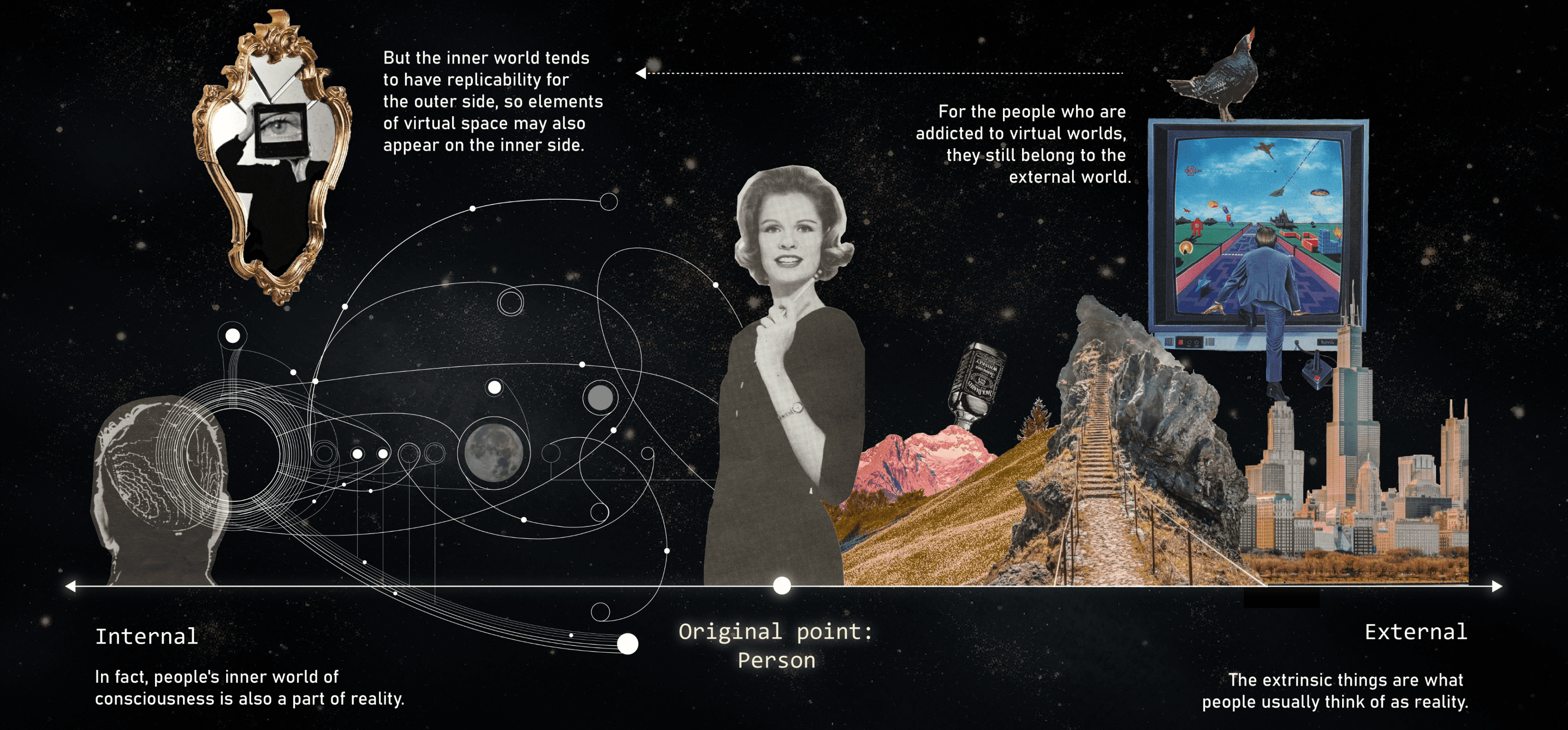 The various types of information in the enclave represent people's interactions in the enclave, and, to some extent, their perception of reality. People's fears of reality pile up as more and more interactions in the enclave are projected in “The Gap”.