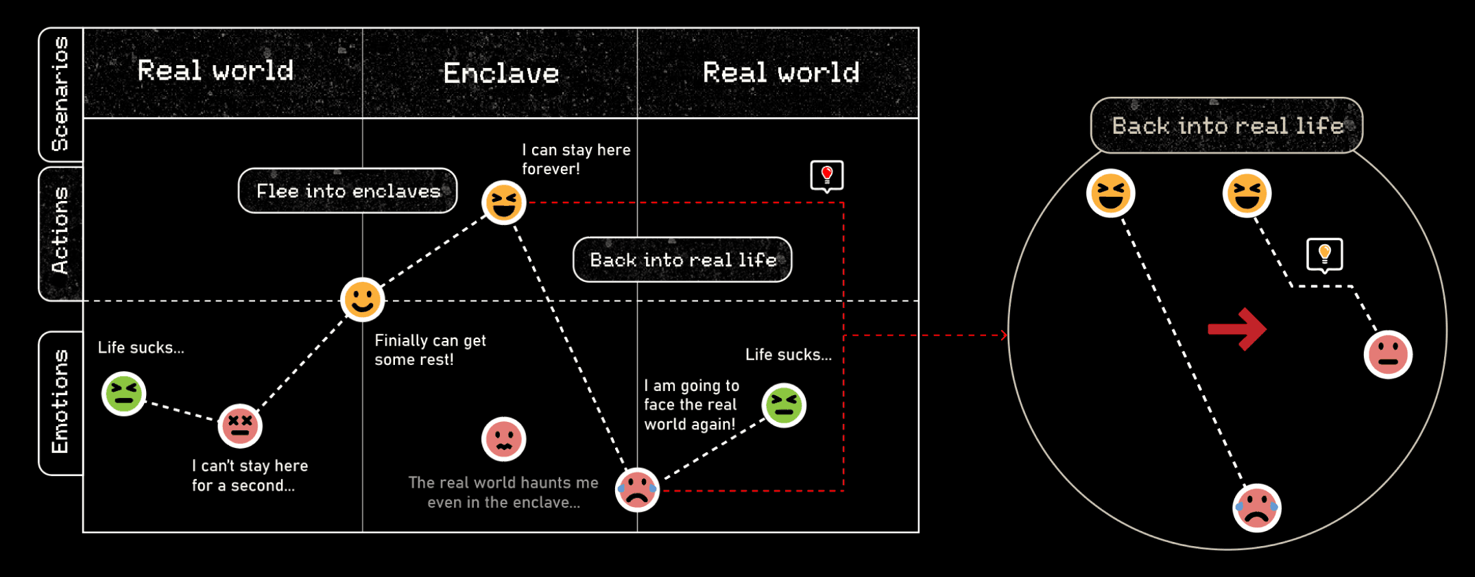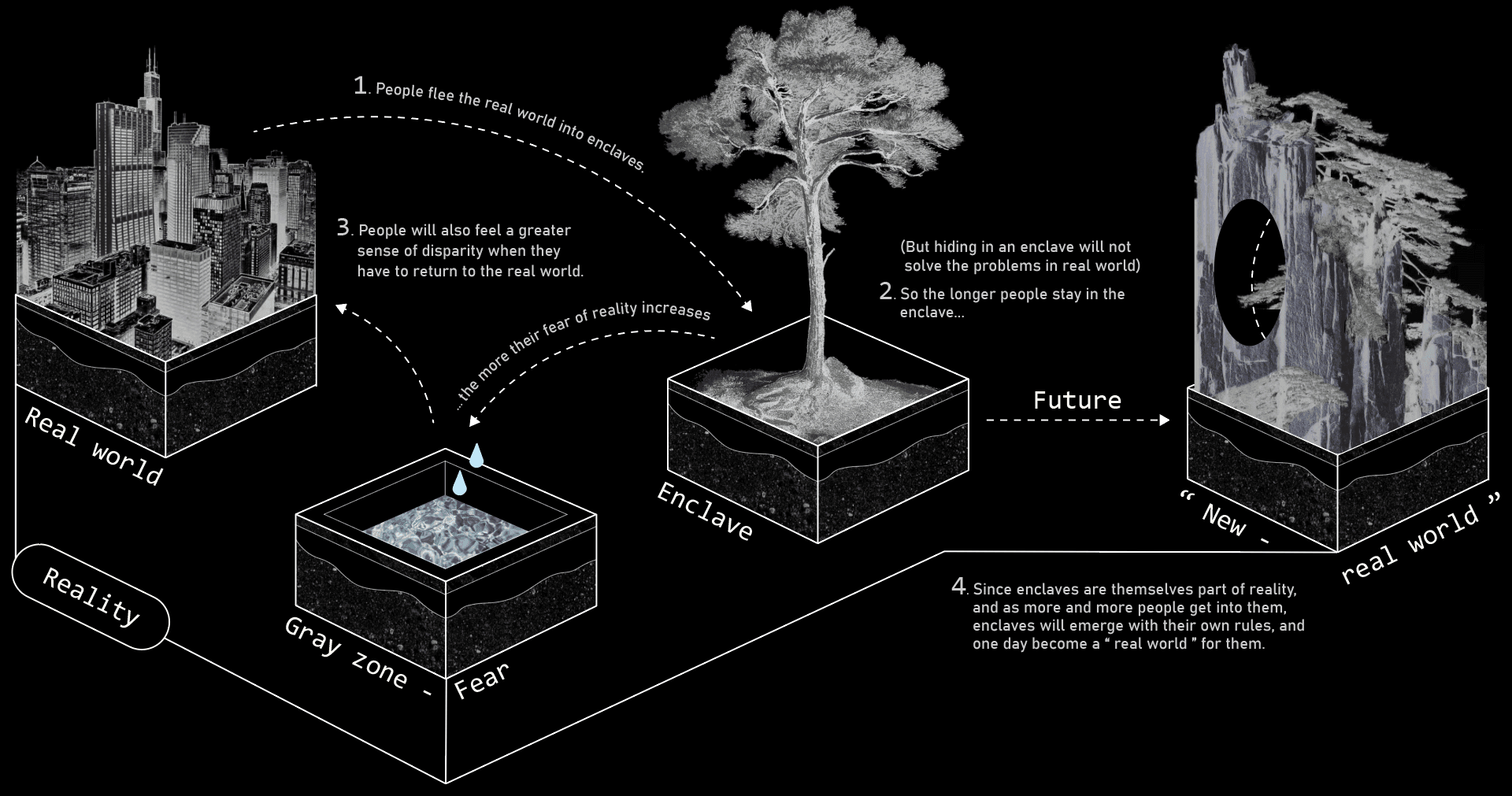 Many of the problems from the real world cannot be solved and fears cannot be dispelled in the enclaves. I wanted to provide some sort of buffer when returning from the enclave to reality, or at least a chance for the fear of the unknown to be perceived.