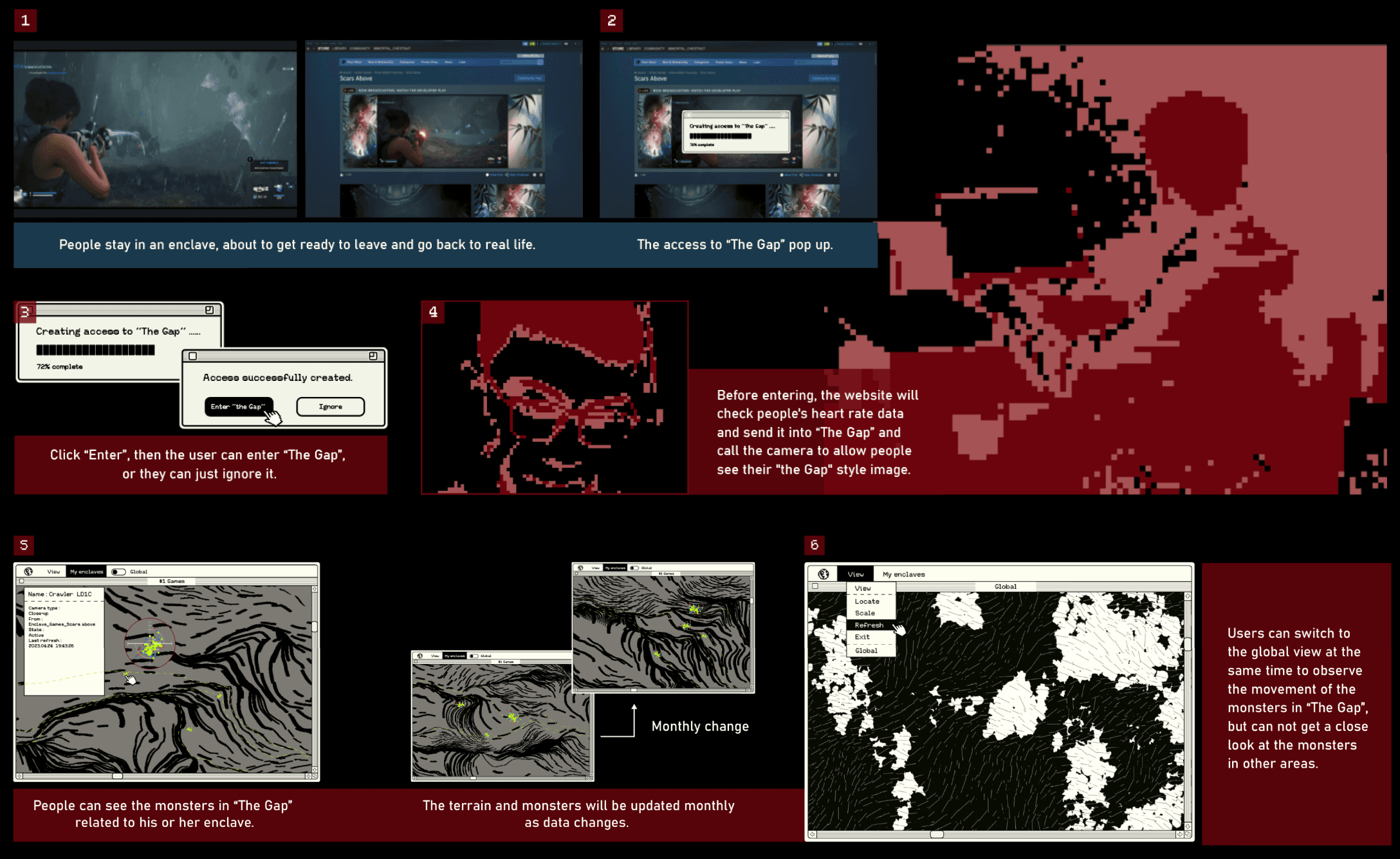 This data will become the feed for these monsters born out of fear and feeding on fear in the gap. Also, different types of data affect different characteristics of monsters, such as the type of enclave affects the type of monster, the amount of data affects how much the monster grows , and people's heart rate data affects their behaviour.